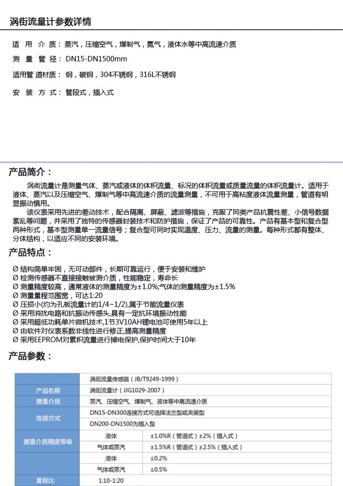 法兰型涡街 蒸汽 压缩空气 氮气 导热油 水等气体液体